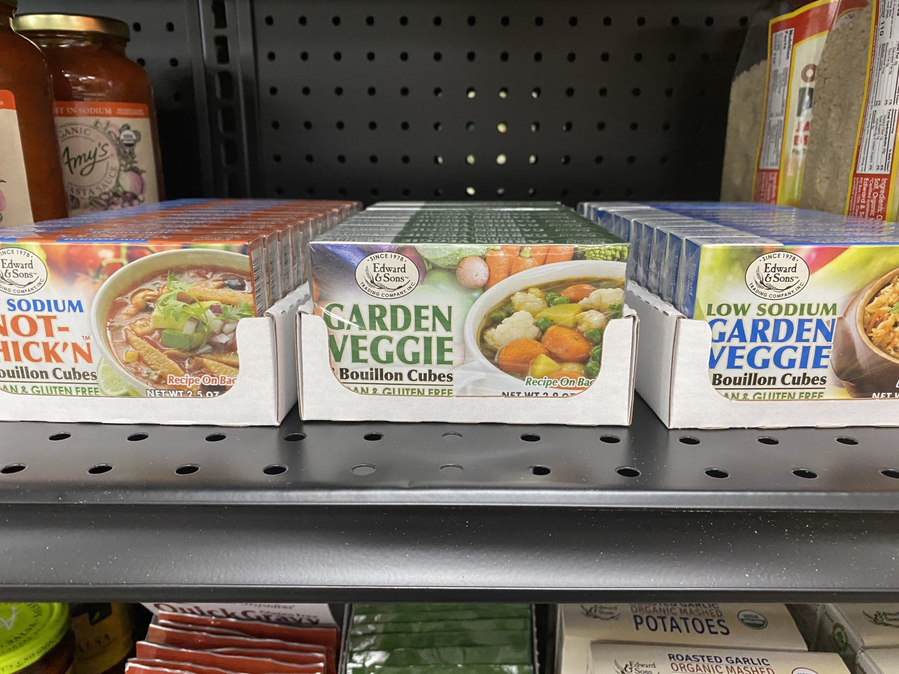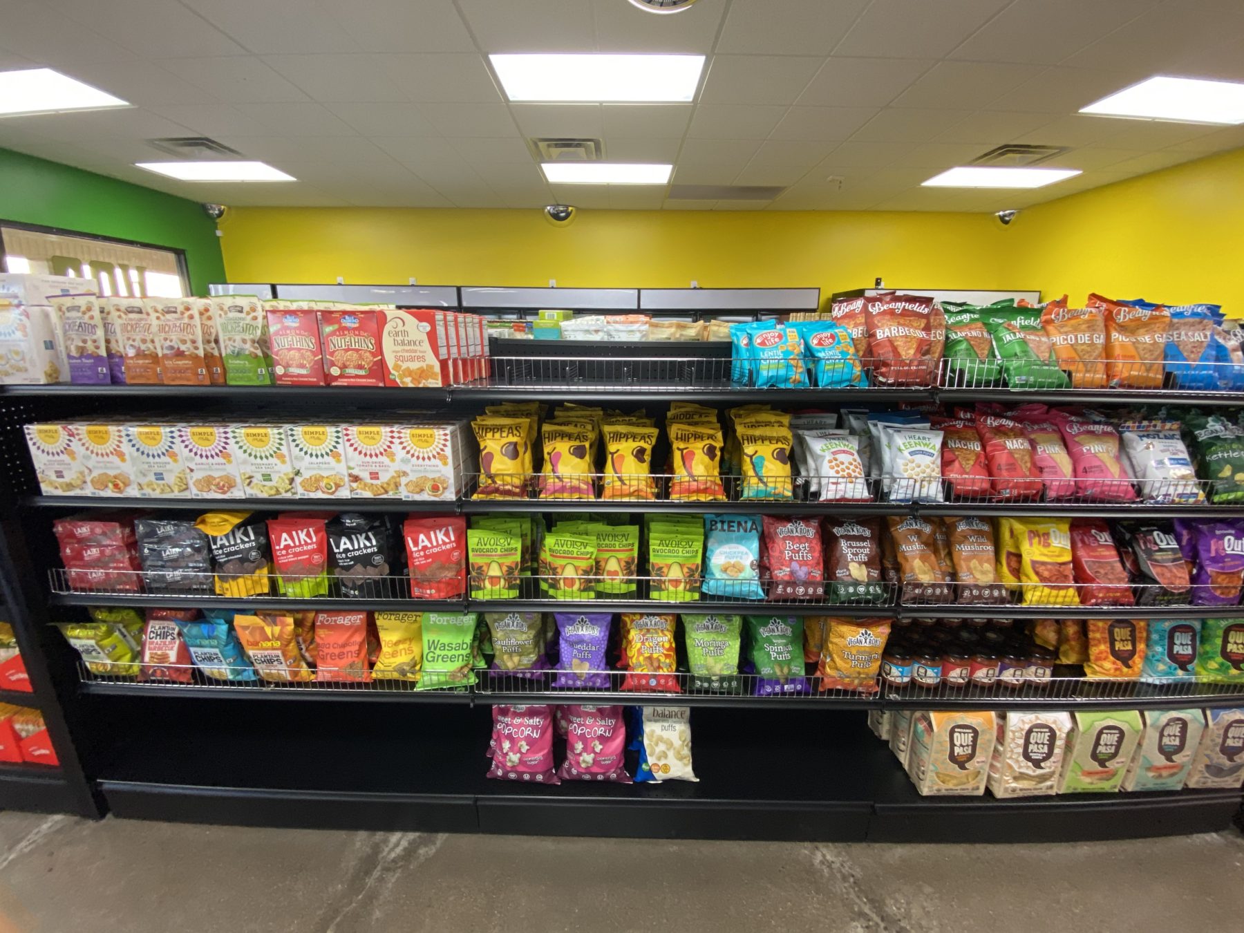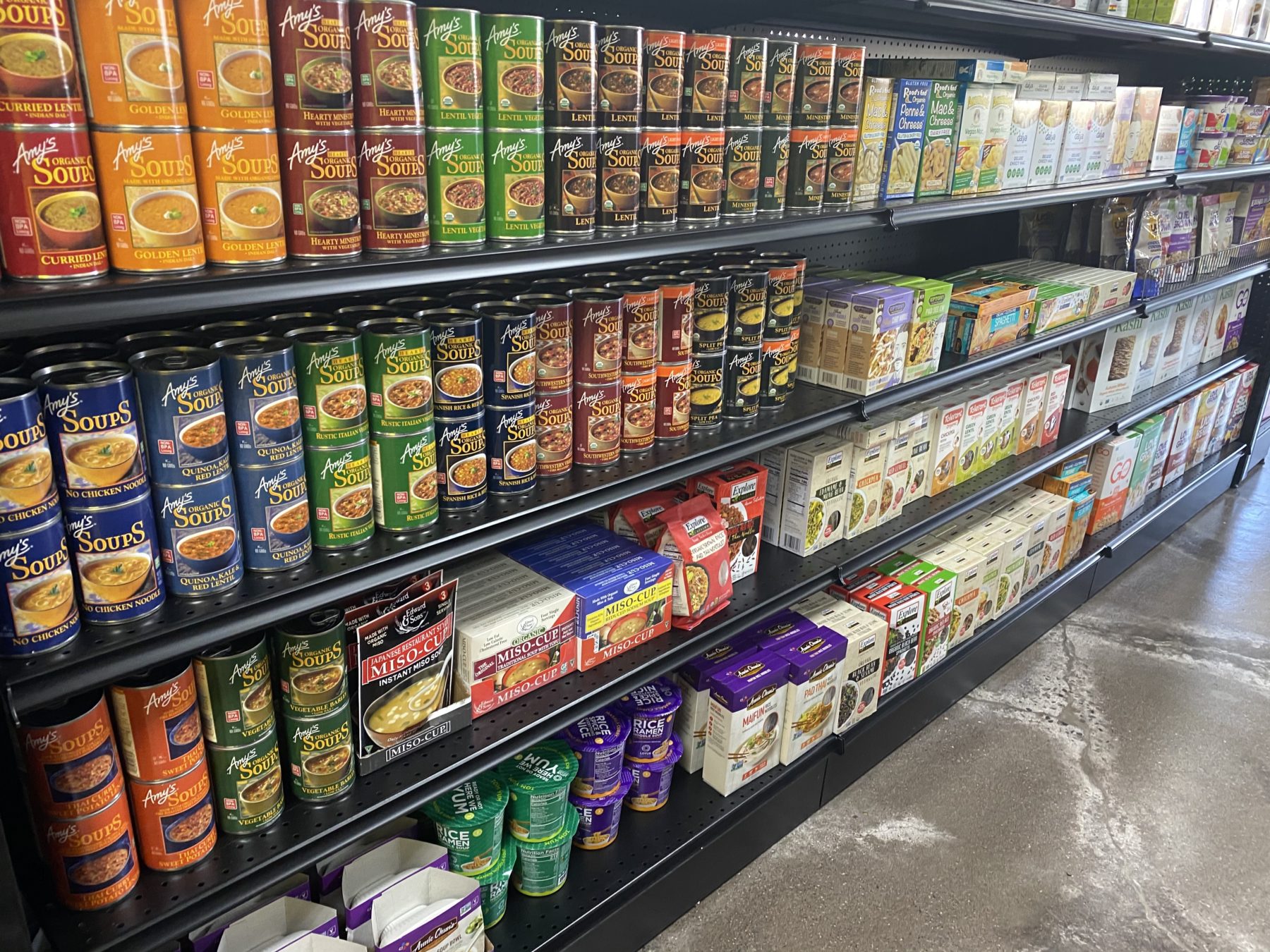 The products range from snack foods to an entire end cap of chocolate treats by Twilight, Thumbs Up, Nelly’s Organics and Justin’s (plus about 10 more brands). They’ve got vegan beef jerky sticks from Viana, a shelf filled with breakfast eats like pancake and muffin mix, soups, and truly so much more.