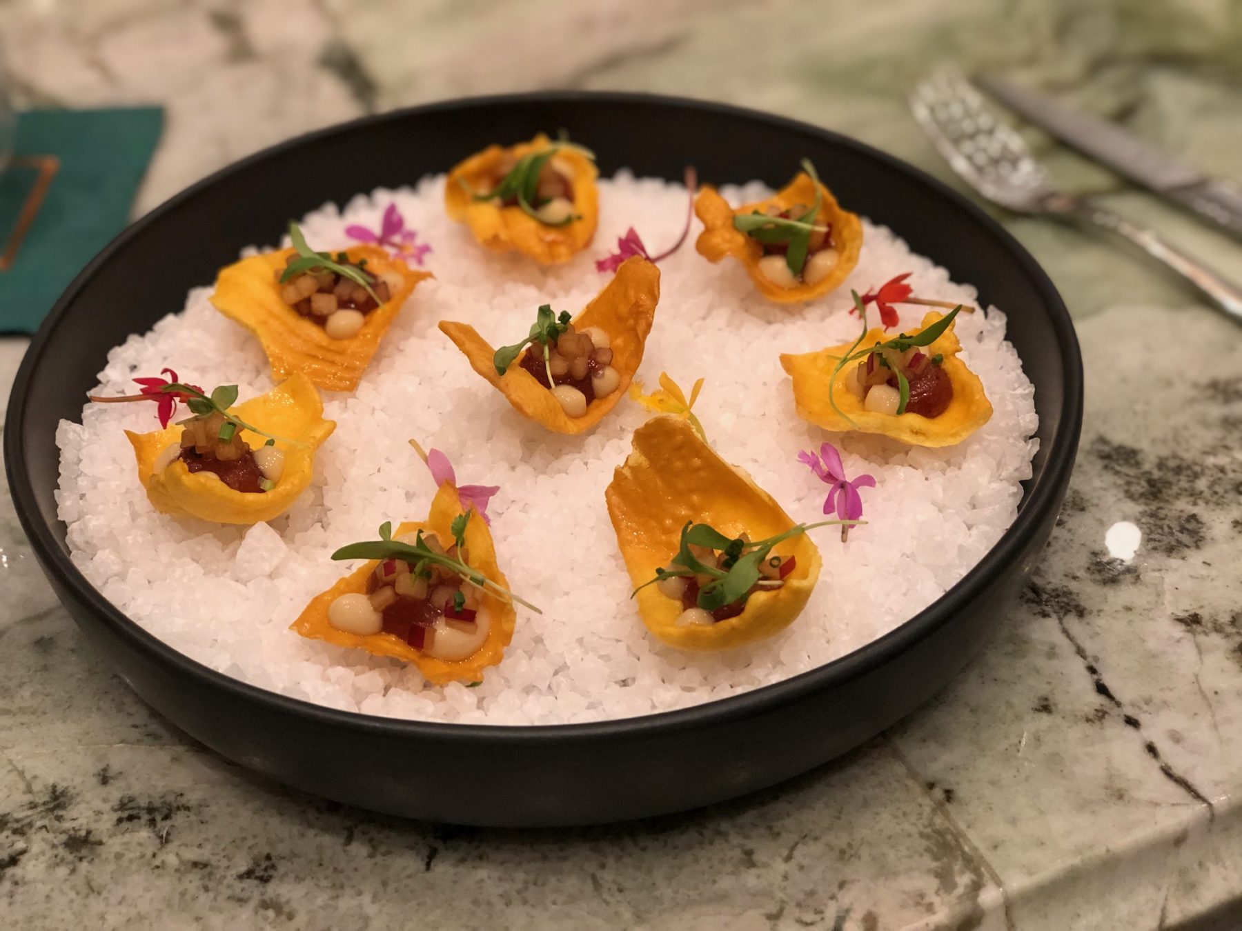 Rice Crackers with Japanese Sweet Potato, Creamy Tofu, and Plum – Chef Andrew Carroll, CATCH Las Vegas
