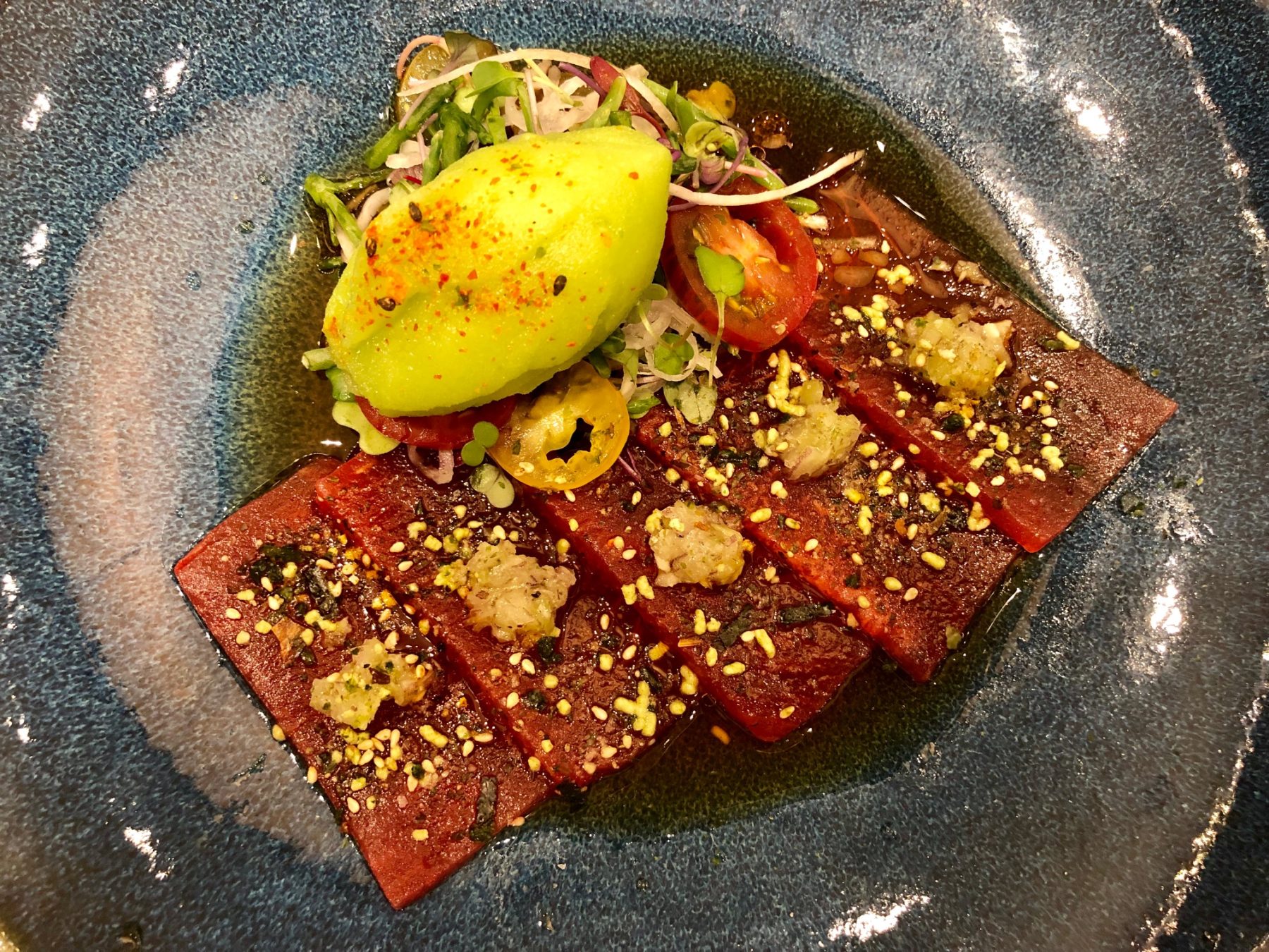 Sake-Compressed Watermelon with Ginger–Wasabi Sorbet, Sea Beans, Yuzu Soy, and Heirloom Tomatoes paired with Sōtō Super Premium Junmai Daiginjo Sake NV – Chef Andrew Carroll, CATCH Las Vegas